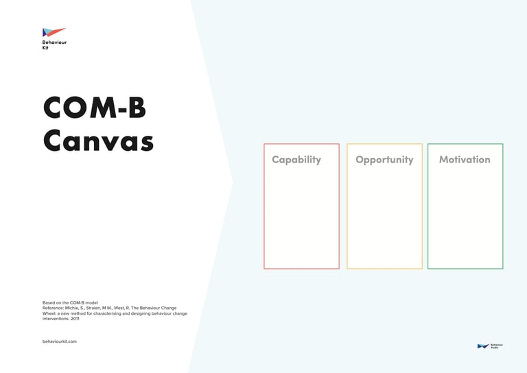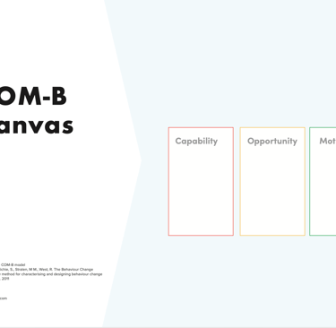 The COM-B Canvas helps you explore each one, including physical and psychological capability, physical and social opportunity, and reflective and automatic motivation. This helps you see what needs to change for behaviour to shift.